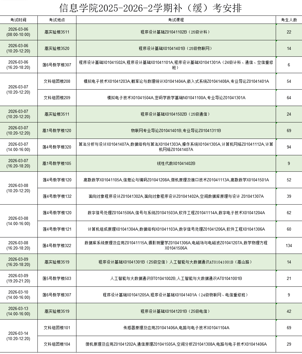 根据本学期教务处补(缓)考总体安排,2025-2026-2学期的补(缓)考安排已上传学校教务系统,请各位考生及时进入教务系统查看具体考试安排。请考生务必携带身份证和学生证(或一卡通)参加考试。