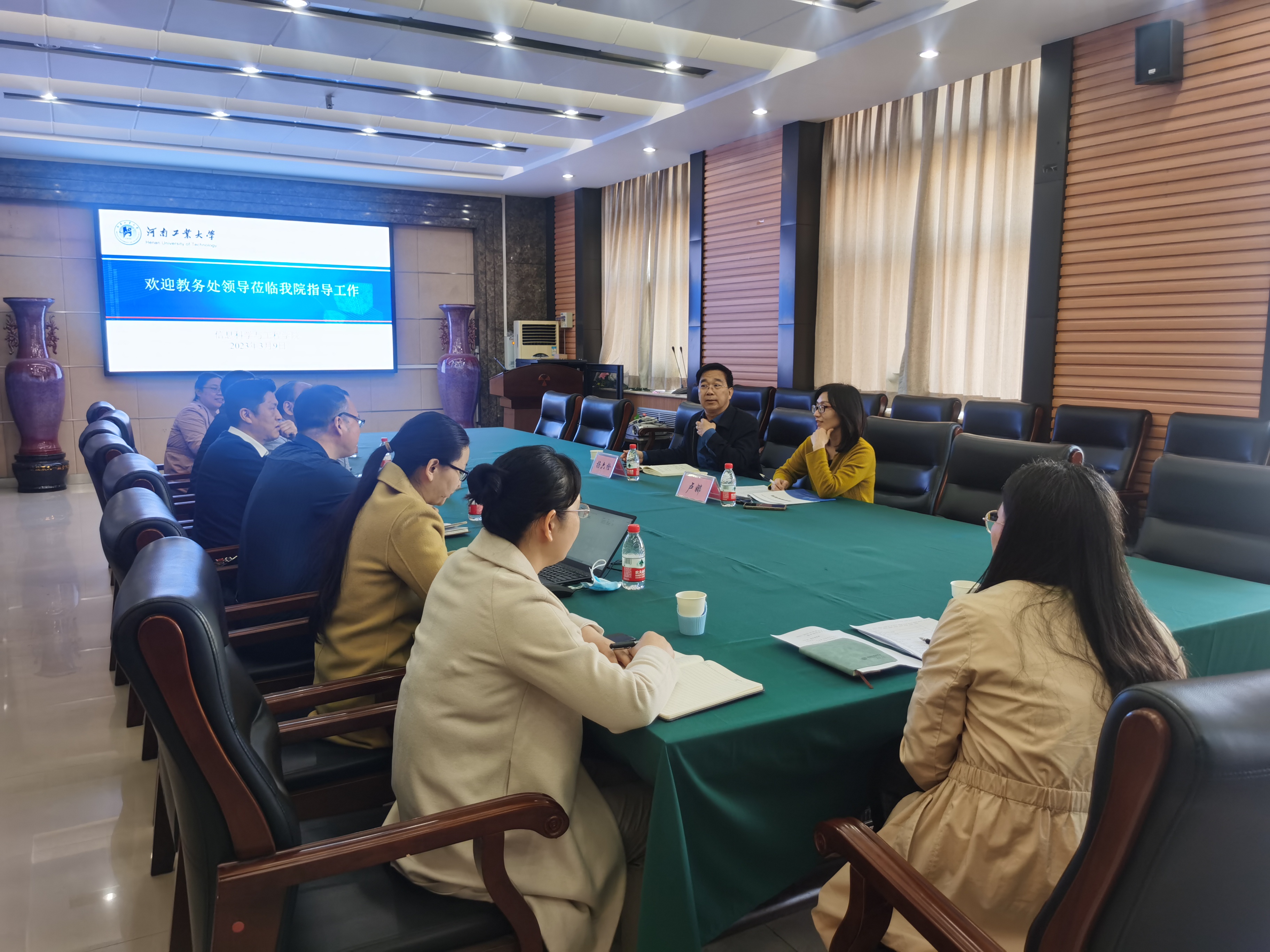 在6225会议室,召开本科专业评价工作推进会。学校教务处处长杨六栓、副处长卢娜,研究生院院长、物联网专业点评审专家邓淼磊,大象传媒
