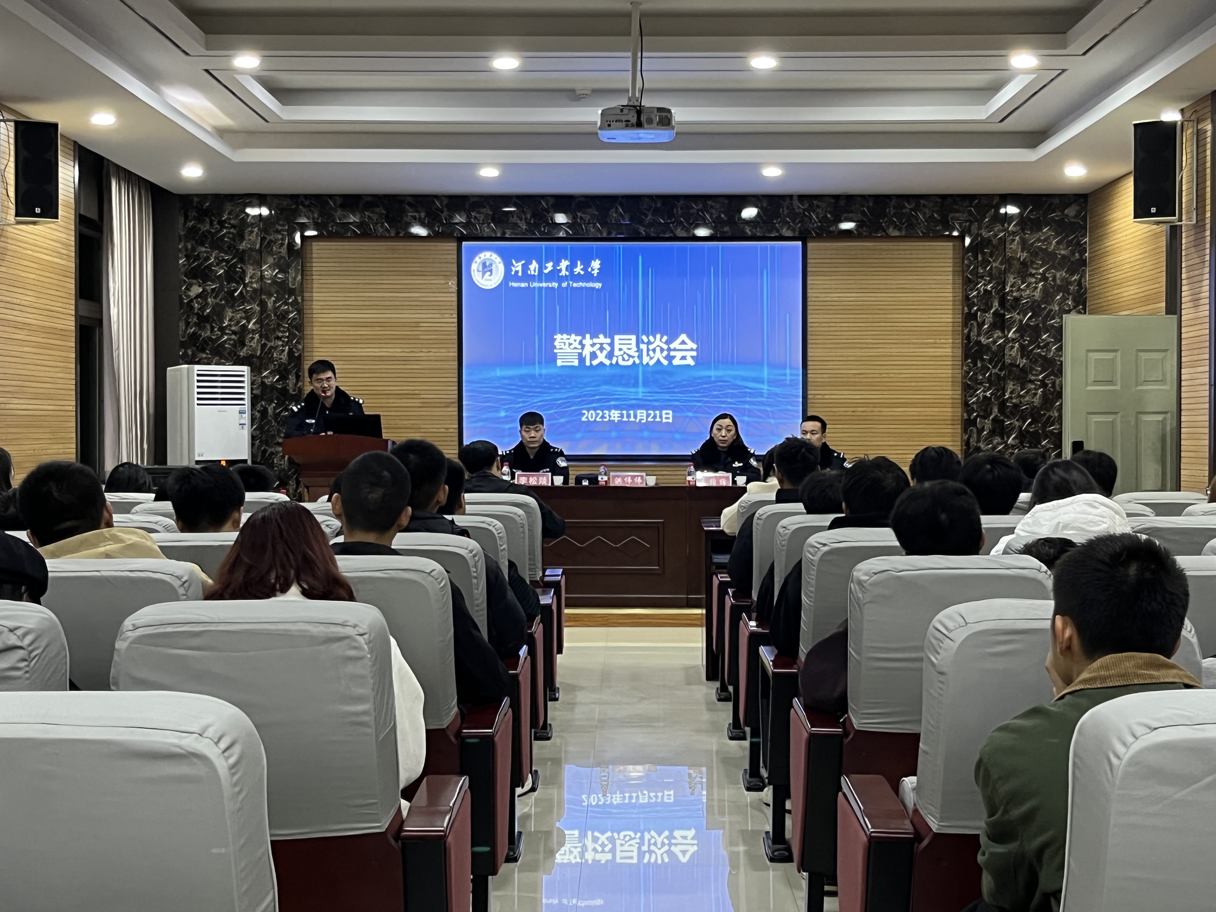 、保卫处联合郑州高新公安分局在学院6228会议室举办警校恳谈会。郑州公安高新区分局情报指挥中心教导员李绵绵、民警洪伟伟、刘智隆、李松燚;学校保卫处副处长李磊、学院全体辅导员及150余名学生代表参加警校恳谈会。