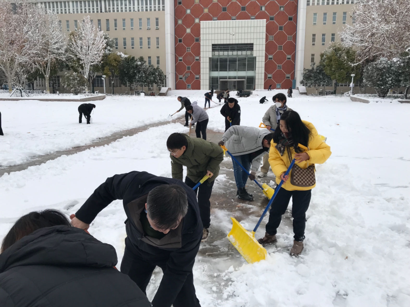 立即组织行政人员和部分在校老师对惟学楼(6号楼)周边区域进行了冰雪清扫工作。