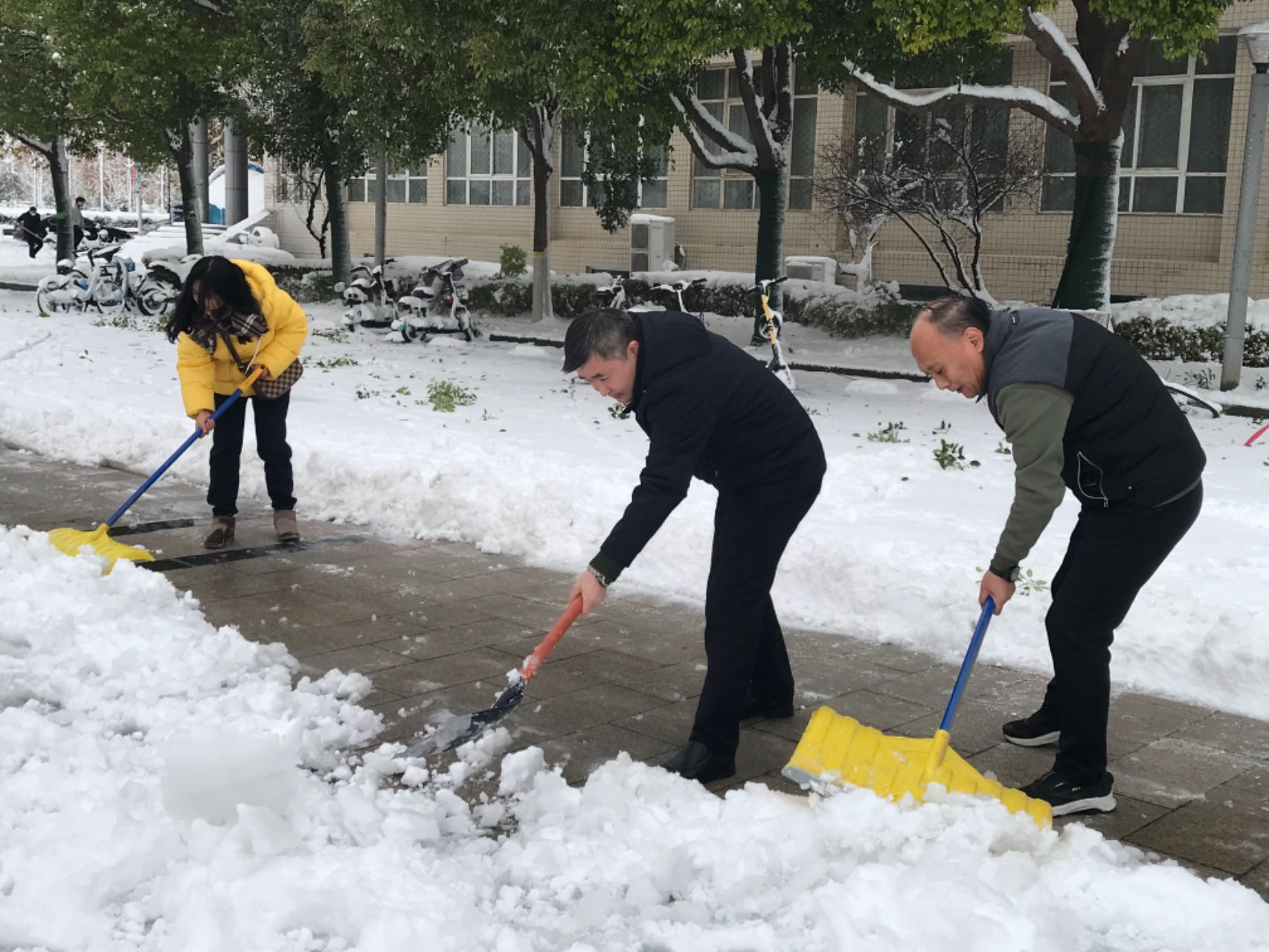 冷冽的寒风没有阻挡大家扫雪的热情,老师们纷纷拿起铁锹、除雪铲等清雪工具,有序开展扫雪除冰工作。大家配合默契,个个干劲十足,用火热的情怀为冬日的校园增添了一股暖流。