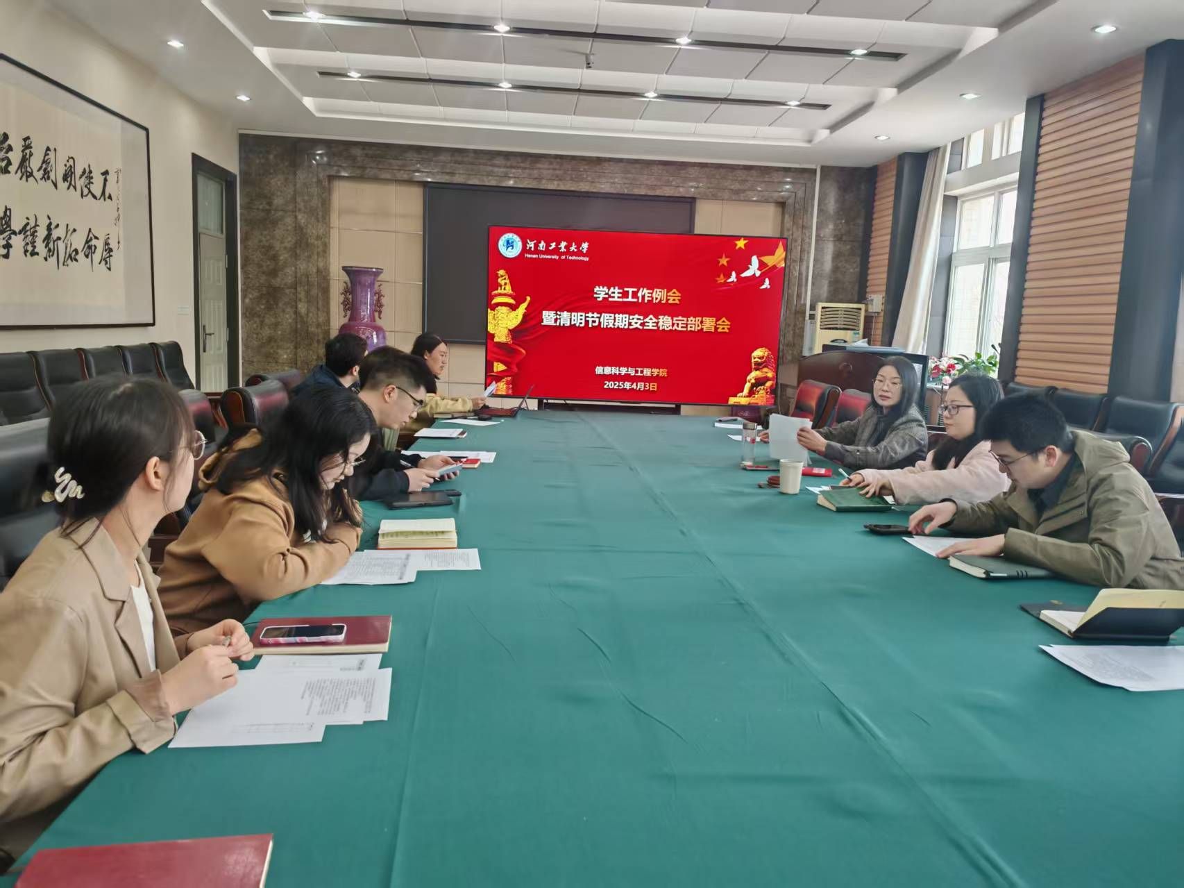 在6号楼6225会议室召开学生工作例会暨清明节假期安全稳定部署会,会议由党委副书记魏雪芹主持,全体辅导员参加。