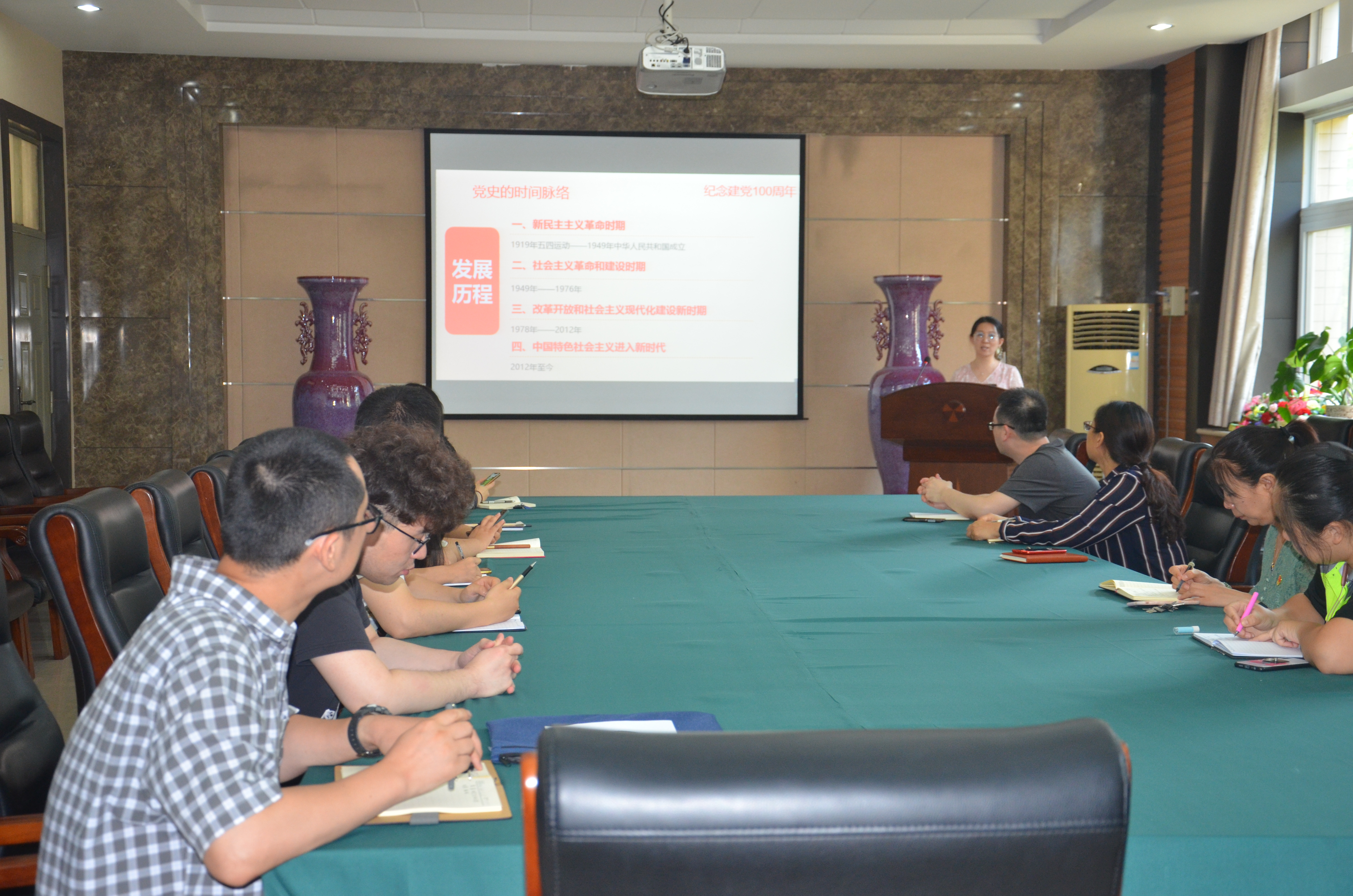 随后,秦瑶为大家讲题为《光辉历程--中国共产党的一百年》的党史学习教育专题党课,她从“党史发展脉络及学习意义、新民主主义革命时期、社会主义革命和建设时期、改革开放和社会主义现代化建设新时期、中国特色社会主义进入新时代”五个方面进行了阐述,把党的一大至十九大贯穿其中,脉络清晰,主题明确,以独特的理论视角,精辟地阐述了中国共产党从诞生到发展再到壮大的艰苦卓绝、光荣辉煌的奋斗历程和宝贵经验,带领大家重温了中国共产党百年历史。