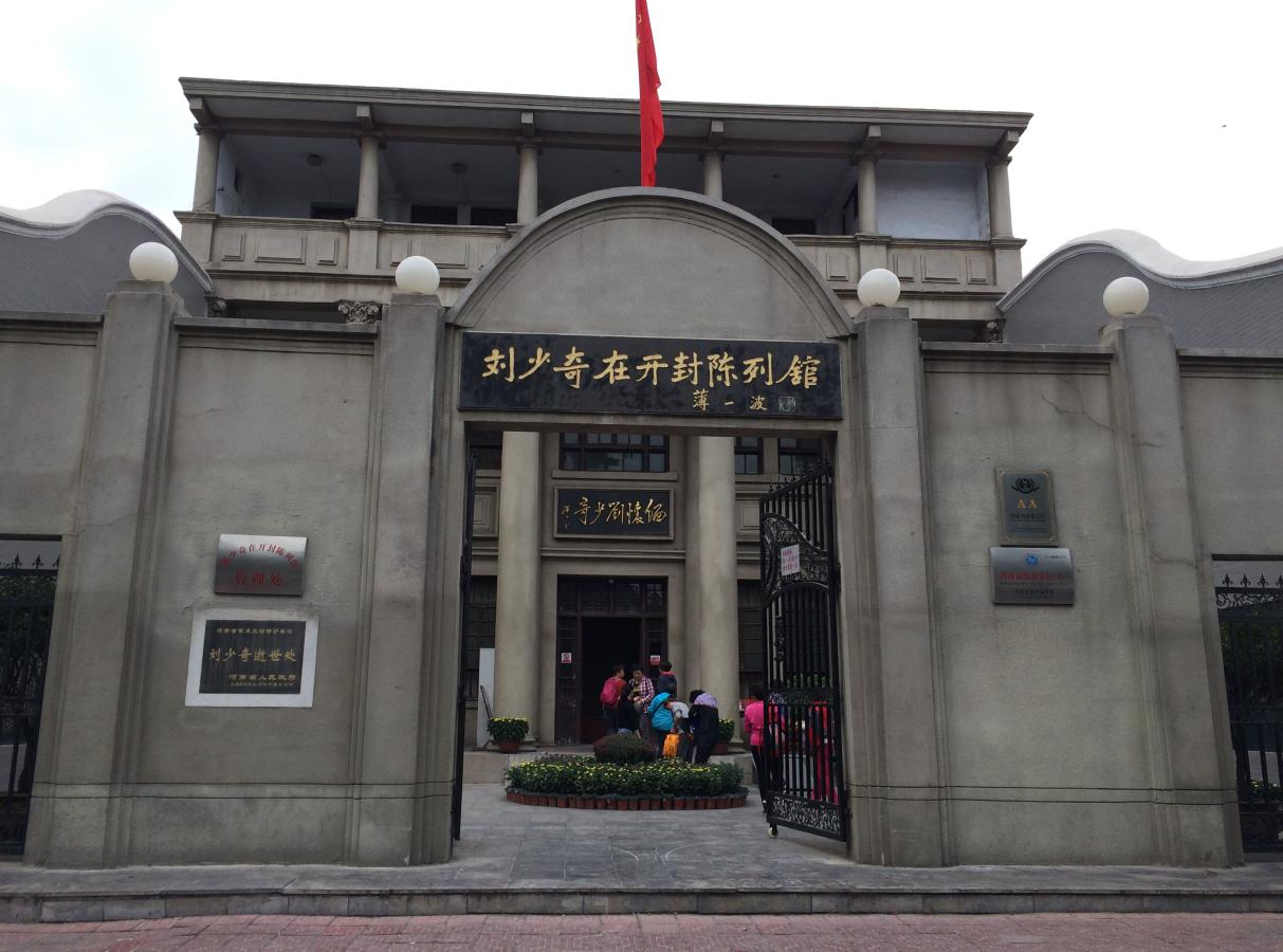 “刘少奇在开封陈列馆(逝世旧址)”位于开封市北土街十号院,现在被定为河南省重点文物保护单位和中小学德育基地。陈列馆座西朝东,大门上方馆名《刘少奇在开封陈列馆》为薄一波题写。前院南北两侧墙上有大型碑刻,分别镌刻有刘少奇《共产党员的修养》手稿局部和邓小平、陈云、李先念、彭真等人的题词。陈列馆照片如下所示: