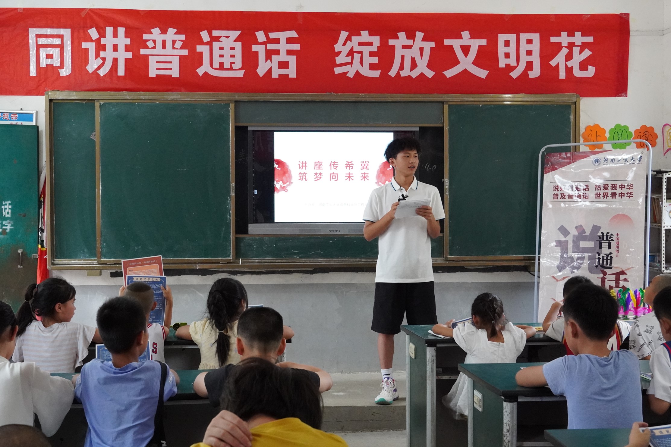 “四海同音,爱“信”同行”社会实践团队于7月14日下午15时至19时在邓州市张村镇冠军村小学开展了推广普通话宣讲活动。