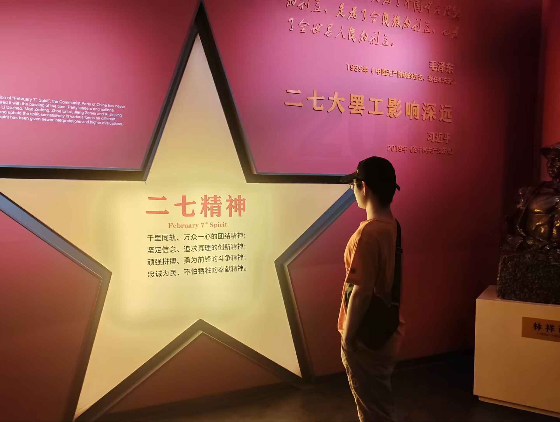 随后学生们有序进入馆内,参观学习了铁路修建、星星之火、革命烈焰、永恒丰碑、精神指引、传承弘扬、红色地标、城市记忆、百年辉煌等展厅的内容,墙上的图片、文字以及陈列的文物生动再现了那段风云激荡的红色历史。同学们沉浸其中,对革命先烈前仆后继的大无畏精神产生由衷的敬佩,也更加深刻地领悟到“二七”精神的真谛。
