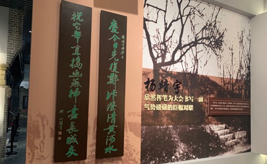 1927年5月,北伐革命军攻克郑州,接着占领开封,第二次北伐取得了重大胜利。6月1日,确山县临时治安委员会在东关大操场组织召开万人大会,杨靖宇欣然挥笔,为大会书写了一副气势磅礴的巨幅对联:“庆今日克复郑汴澄清黄河水,祝他年直捣幽燕扫尽长城灰”。图二为纪念馆内的对联展示。