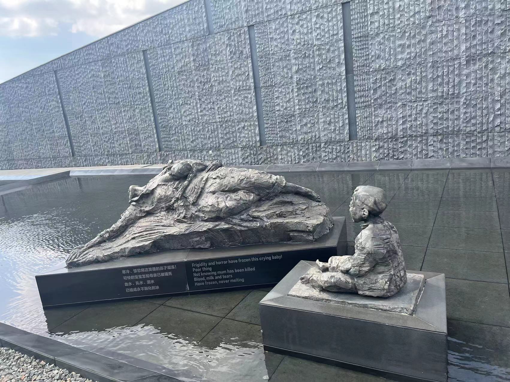 走近纪念馆,首先映入眼帘的是展示在走道的一排雕塑群。最为显眼的是根据一位女子丈夫孩子都被杀死并且她自己被日本侵华日军强暴后的神情刻画而出的雕塑。“仅仅是看到这个雕塑开始,心情就开始变得压抑,那个时候的他们该有多么无助痛苦。”一个成员说道。