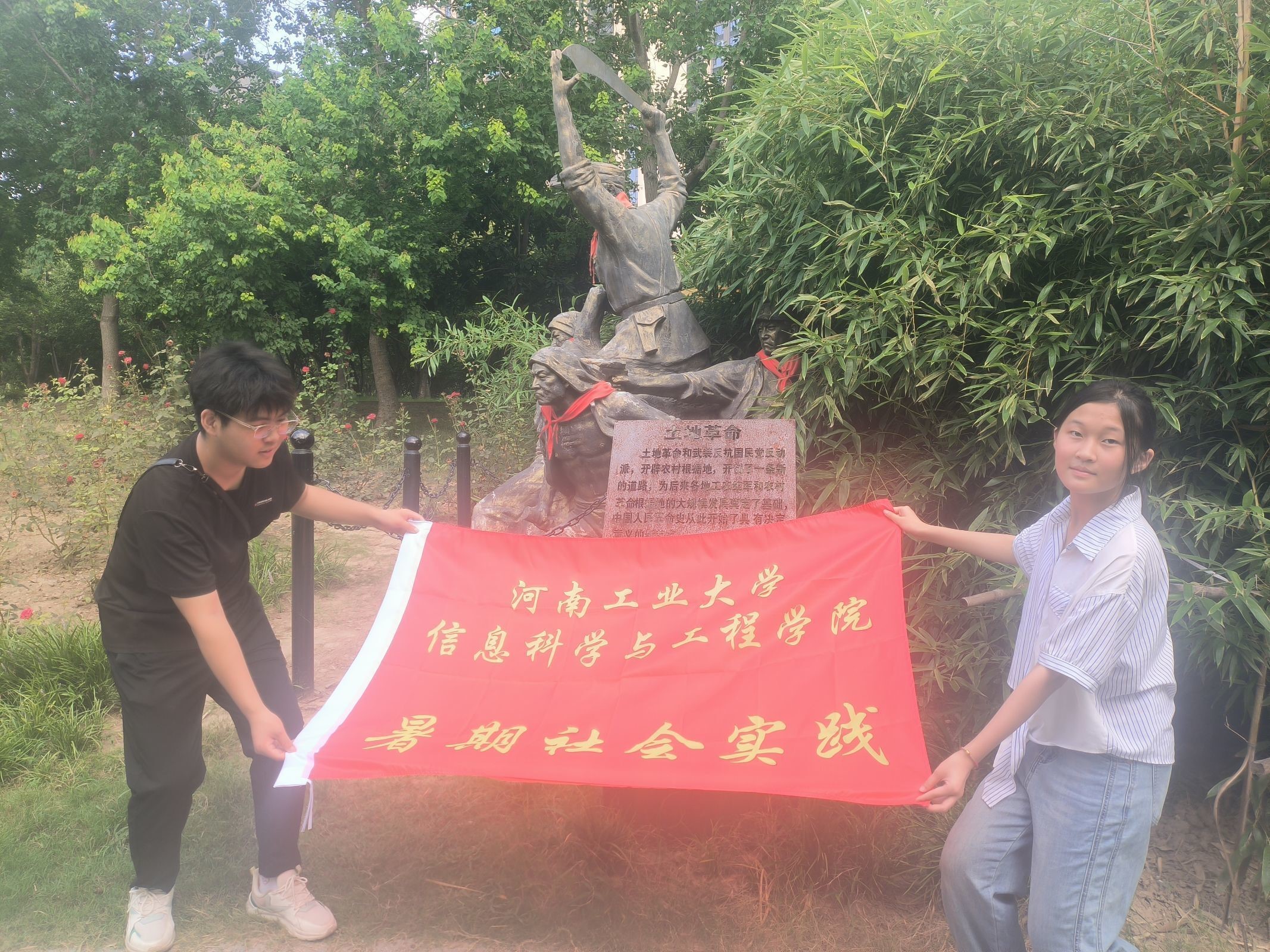 团队与土地革命纪念雕像的合影