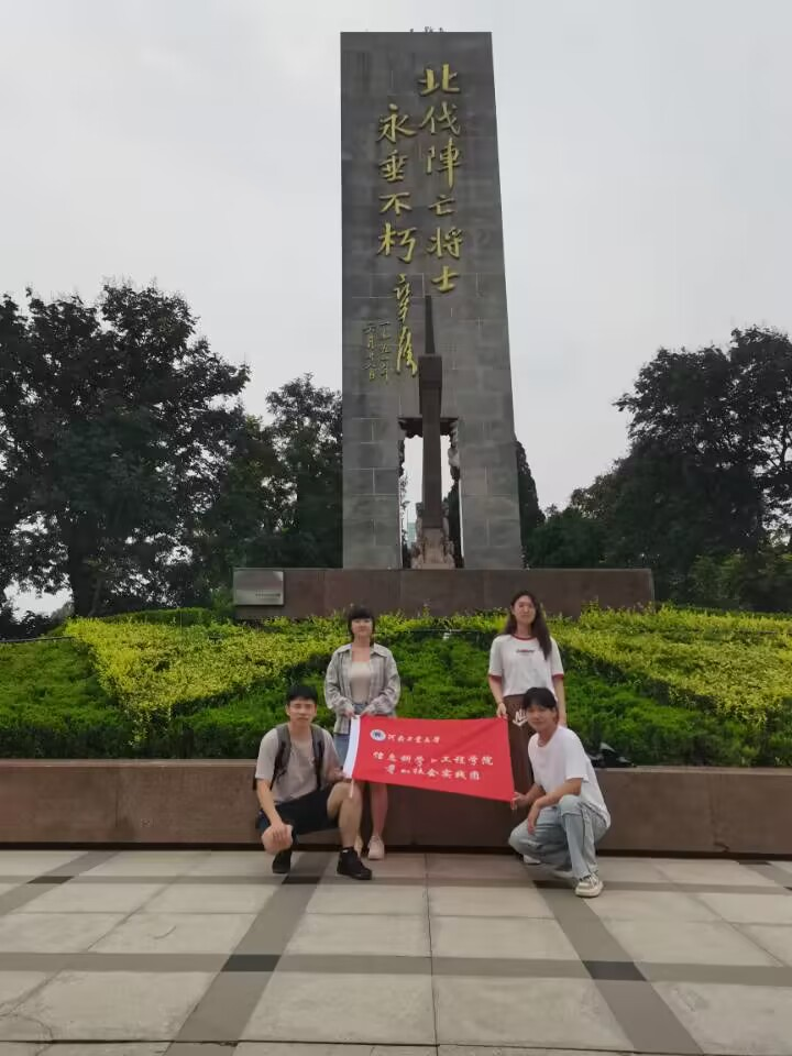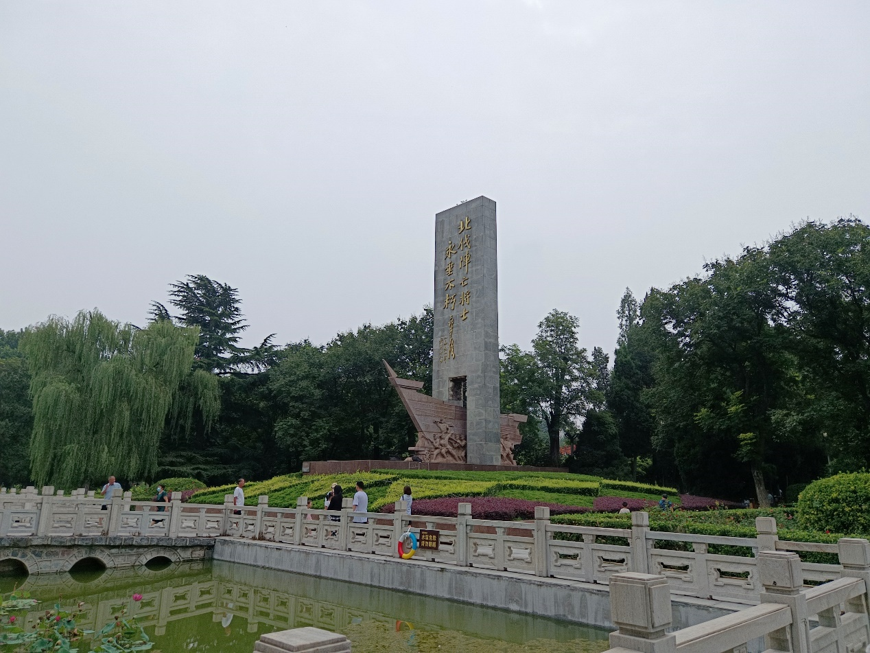 “青春无悔”暑期社会实践团队于2023年8月25日开展实践活动,部分队员前往碧沙岗公园的北伐阵亡将士纪念碑进行祭奠活动。在此之前,实践团队了解到碧沙岗公园前身是冯玉祥将军为安葬、纪念北伐烈士所建的陵园,公园名取“碧血丹心 血殷黄沙”之意,园内有北伐阵亡烈士纪念碑和三民亭等见证岁月的变迁。