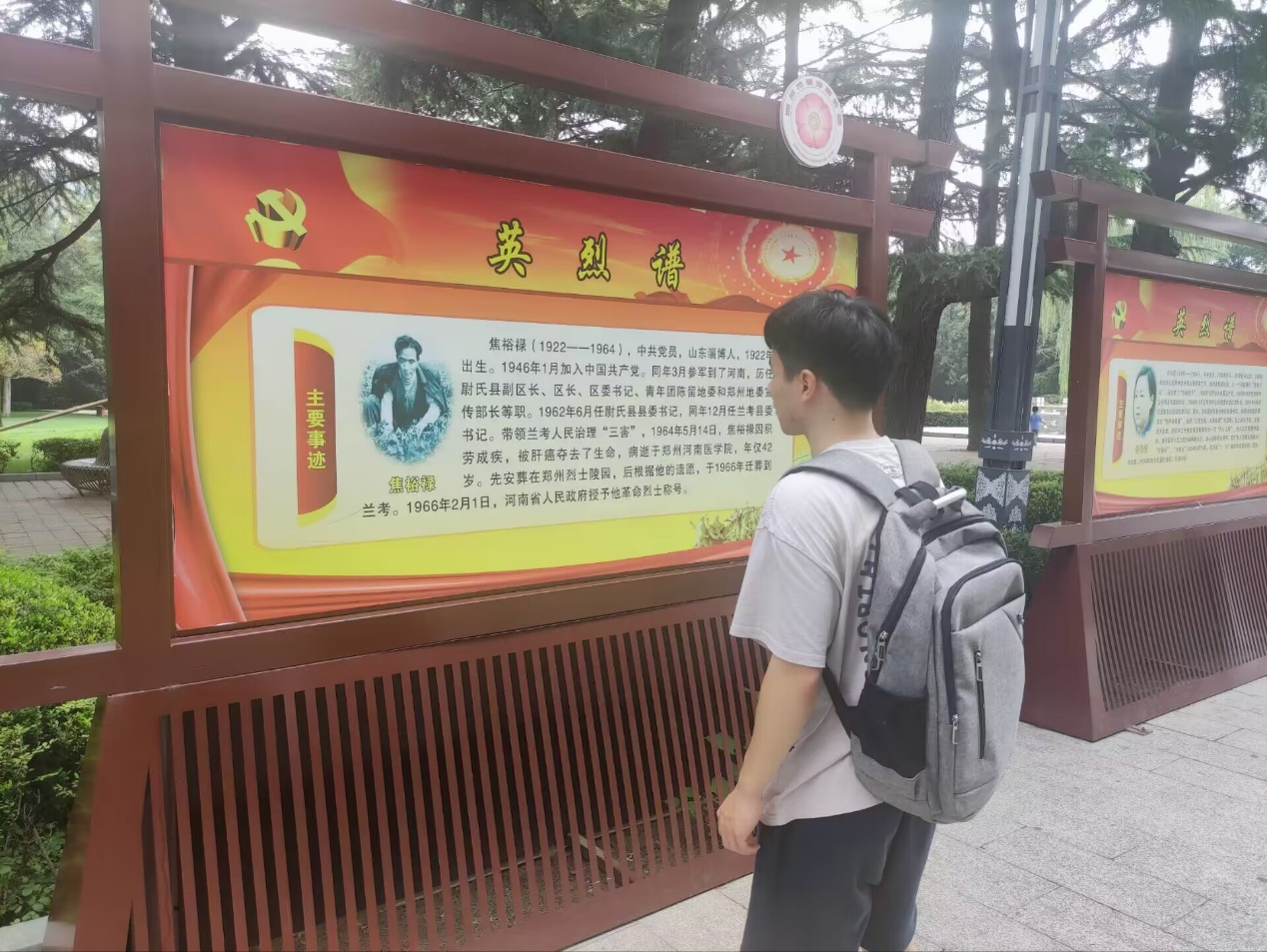 随后,实践队在经过英烈碑时驻足观看,上面展示了九位曾经生活在中原大地共产党人的红色感人故事。有为共产党的成立和发展作出卓越贡献,为人民生活谋福祉的李大钊先生,有曾在解放战争时率领中原军区第一纵队第一旅突围中原,创下世界军事史上的奇迹的皮定均将军,还有拼搏一生治理“三害”,为人民幸福奋斗终身的焦裕禄前辈。队员们在观看先辈事迹后,无一不激情澎湃,并更加明确当代青年所肩负的时代使命,树立为我们伟大祖国的复兴贡献自己力量的决心。