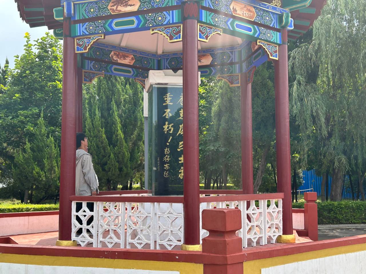 进入大门,园长带领实践小队参观并详细介绍了它的历史。这一抗战遗址始建于1945年3月,隶属于杞县人民政府,由杞县退役军人事务局管理。占地100余亩,四周环以红色砖墙,彩釉陶瓦覆顶,大门向北,五间仿古式建筑。