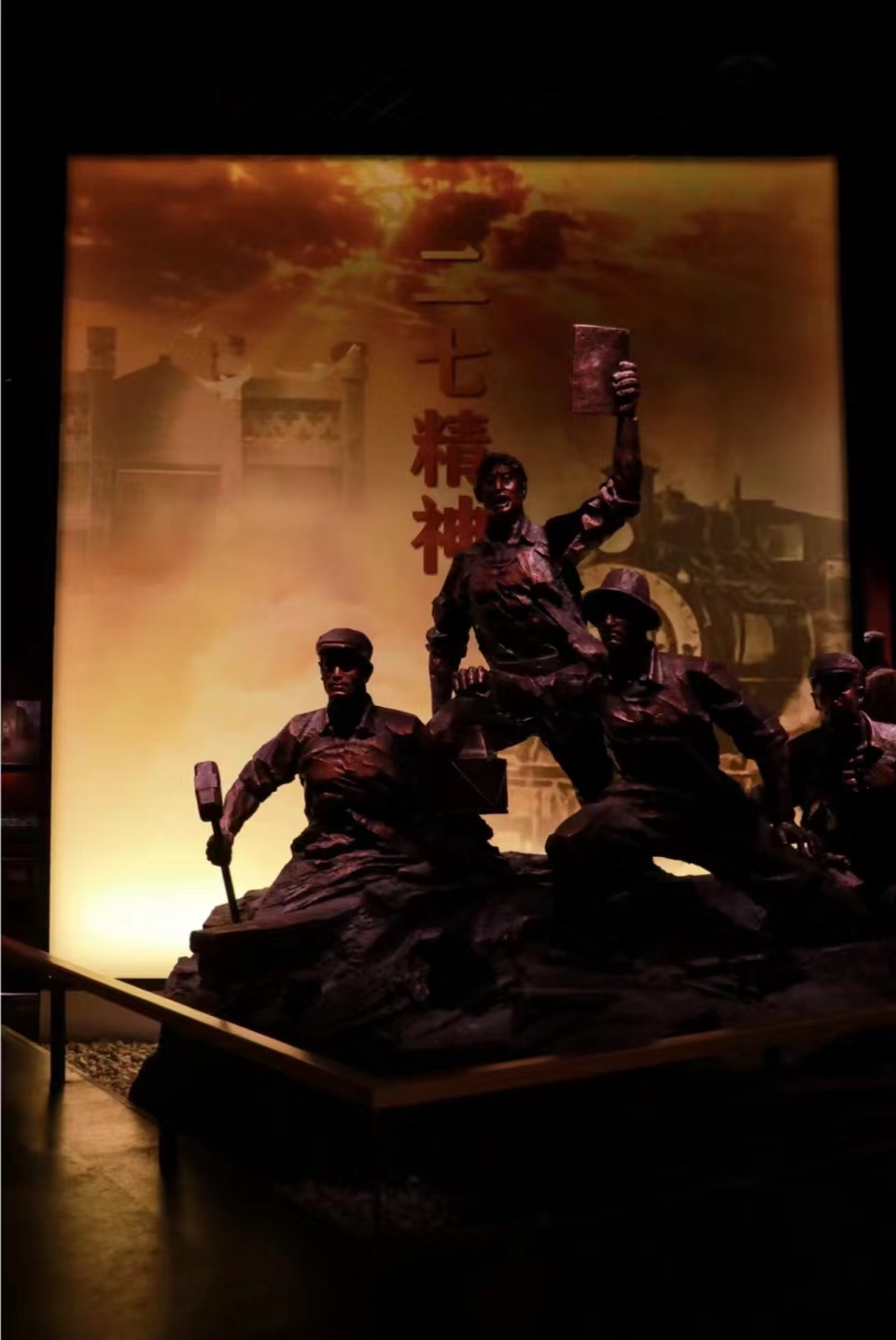 随着队员们走进展馆,光线逐渐暗淡下来。首先映入眼帘的是京汉铁路大罢工的铜像,在这一整面的铜像上,人物的表情刻画得栩栩如生,仿佛他们还在为曾经的不公平抗争,