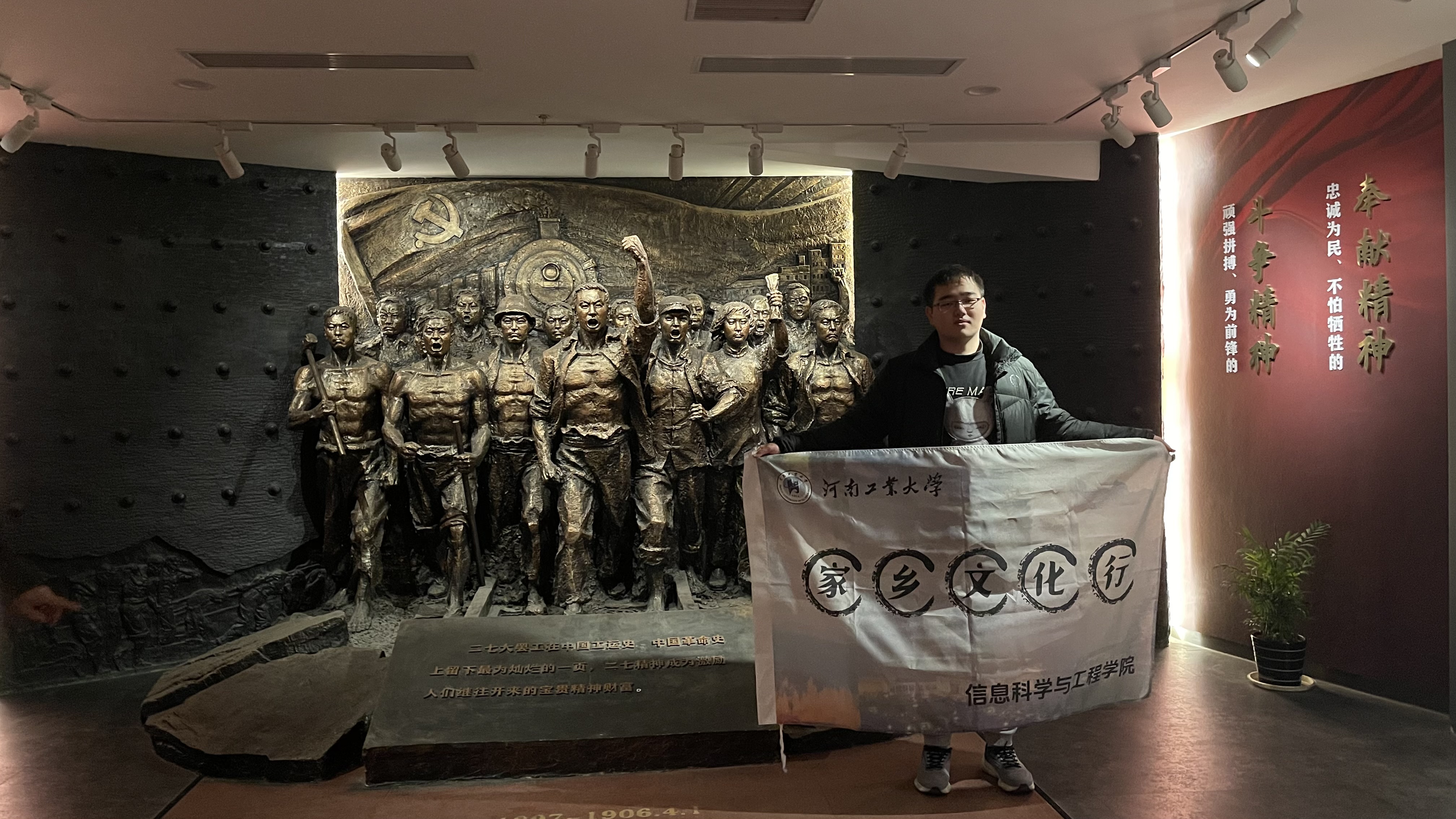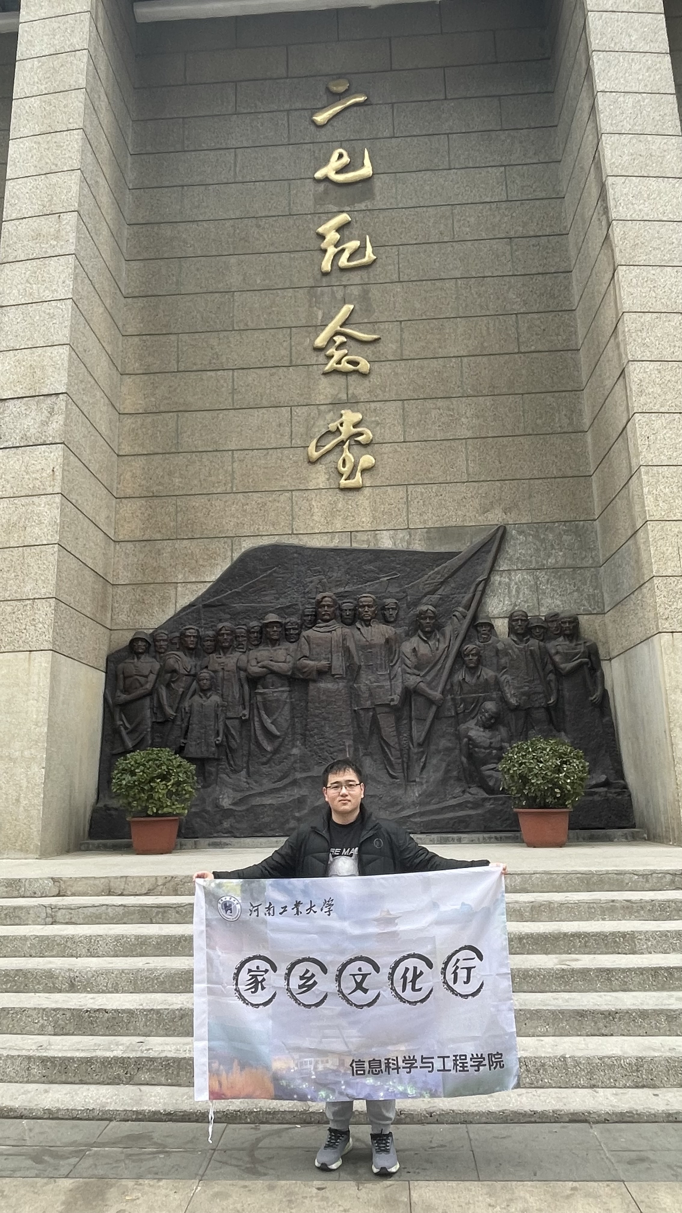 “家乡文化行”寒假实践活动团队迎风启程,前往二七纪念堂,感悟英雄足迹,进行线下文化宣传。团队成员在此深入了解二七纪念堂的背景故事,缅怀革命先烈,呼吁传承红色基因。