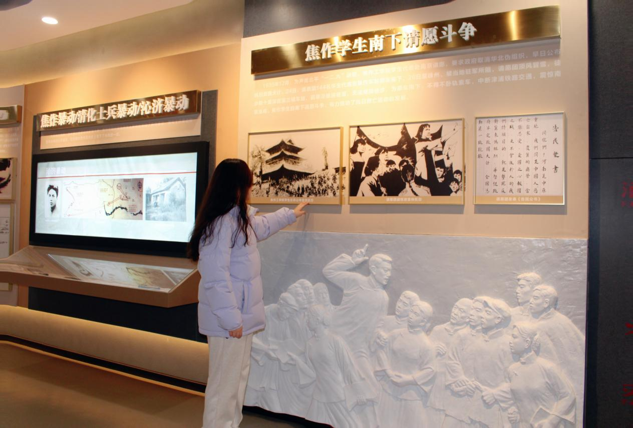 跟随讲解员的引导,团队成员认真阅读了焦作学生南下请愿斗争的历史,给予团队成员极大的鼓舞。