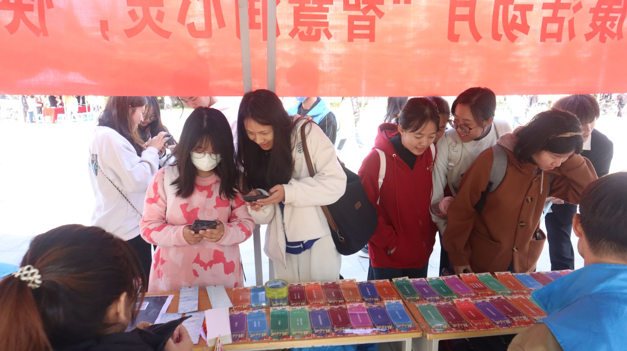 活动当天,钟楼广场上人头攒动,热闹非凡,路过的同学纷纷侧目,积极参与到各项游戏中来。翻花绳区域,一根橙色的绳子在同学们的手中灵活翻飞;跳房子区域同样吸引了众多同学的目光,大家按照规定的路线和格子跳跃,欢声笑语不断,这两项游戏不仅锻炼了同学们的身体协调性,更让大家在轻松愉快的氛围中找回了童年的记忆和乐趣。猜字谜和智慧答题环节更是将活动推向了高潮,一系列精心设计的字谜和题目让同学们绞尽脑汁,争相抢答,答对者还可以亲手制作属于自己的漆扇或书签,这一环节不仅考验了大家的智慧和知识储备,更增添了活动的趣味性和互动性。在制作漆扇和书签的区域,同学们纷纷拿起画笔,发挥自己的创意和想象力,制作出独一无二的漆扇或书签,些作品不仅展现了大家的艺术才华,更成为了这次活动的珍贵纪念品,让同学们拥有了属于自己独一份的漆扇或书签,感受到了成就感和喜悦。