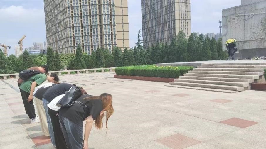 7月4日上午9点34分,“革命烙印·红色印记”寻迹团团队出发前往位于河南省郑州市中原英烈纪念馆对面的郑州烈士陵园,进入园内,一座巨大的丰碑庄严的伫立在中央,引人敬畏,7月4号中午11点49分,队员们参观完毕,并向丰碑致敬、鞠躬以表缅怀之情,如图5。