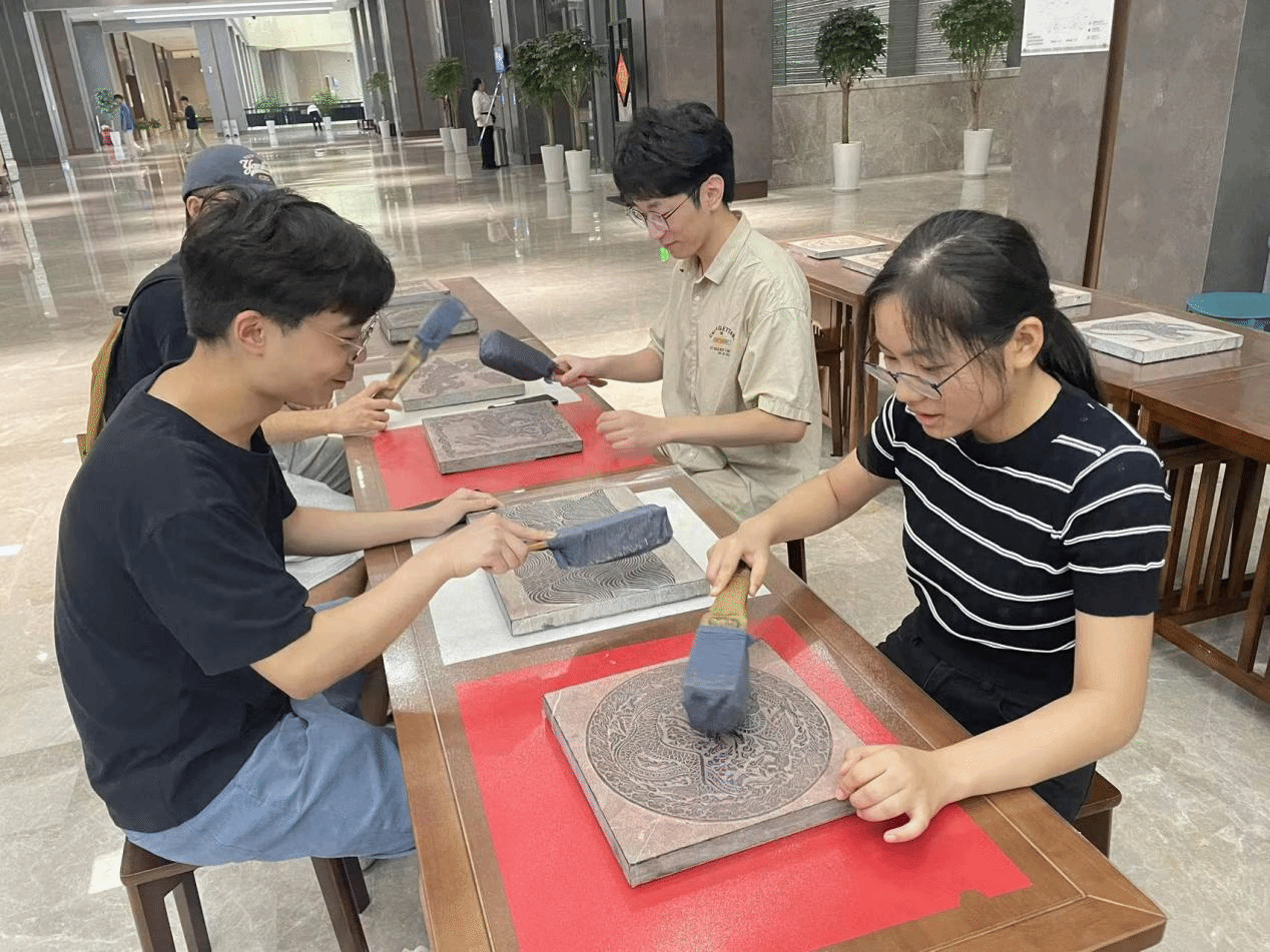 小组成员把一张坚韧的薄纸事先浸湿,再敷在石碑上面,用刷子轻轻敲打,使纸入字口,待纸张干燥后用刷子蘸墨,轻轻地、均匀地拍刷,使墨均匀地涂布纸上,然后把纸揭下来,一张黑底白字的拓片就复制完成了。它是将石刻或木刻文字,用纸、墨拍印出来,以便保和传播的工艺方法。