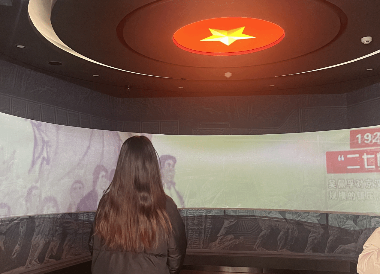 1月13日上午10时,成员苏闪闪同学在二七纪念塔七层观看全景视频,学习京汉铁路工人运动所孕育的二七精神。视频生动再现了工人们在封建军阀和外国资本家压迫下的艰苦生活,以及1923年2月4日在共产党人领导下举行的大罢工。苏闪闪认真记录要点,意识到二七精神是新时代青年应传承和弘扬的力量。