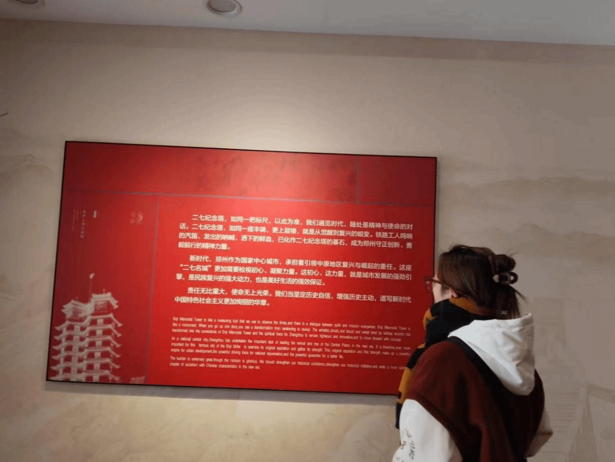 1月13日下午3时,成员李思娴同学在二七纪念塔一层序厅学习二七精神。她站在序厅中央,面前的展示板阐述了二七纪念塔的象征意义和二七精神的内涵。展示板上的文字强调了二七纪念塔作为郑州地标和精神丰碑的重要性,以及它所见证的铁路工人斗争和牺牲。