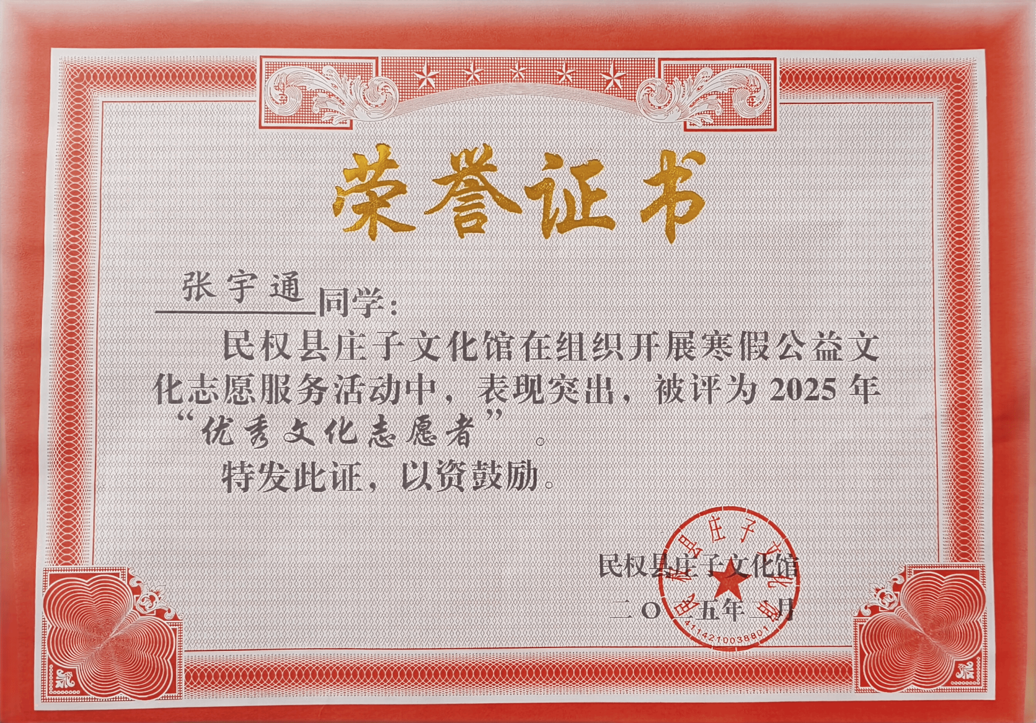 此次实践活动成果显著,“逍遥实践先锋队”不仅为游客提供了优质的志愿服务,还成功传播了庄子文化。凭借在寒假公益文化志愿服务中的出色表现,队员们被民权县庄子文化馆评为2025年“优秀文化志愿者”。这一荣誉不仅是对队员们努力的肯定,更是激励他们在未来继续投身文化传播与志愿服务的动力。队员们表示,将以此次活动为契机,不断提升自己,为传承和弘扬优秀传统文化贡献更多的力量。