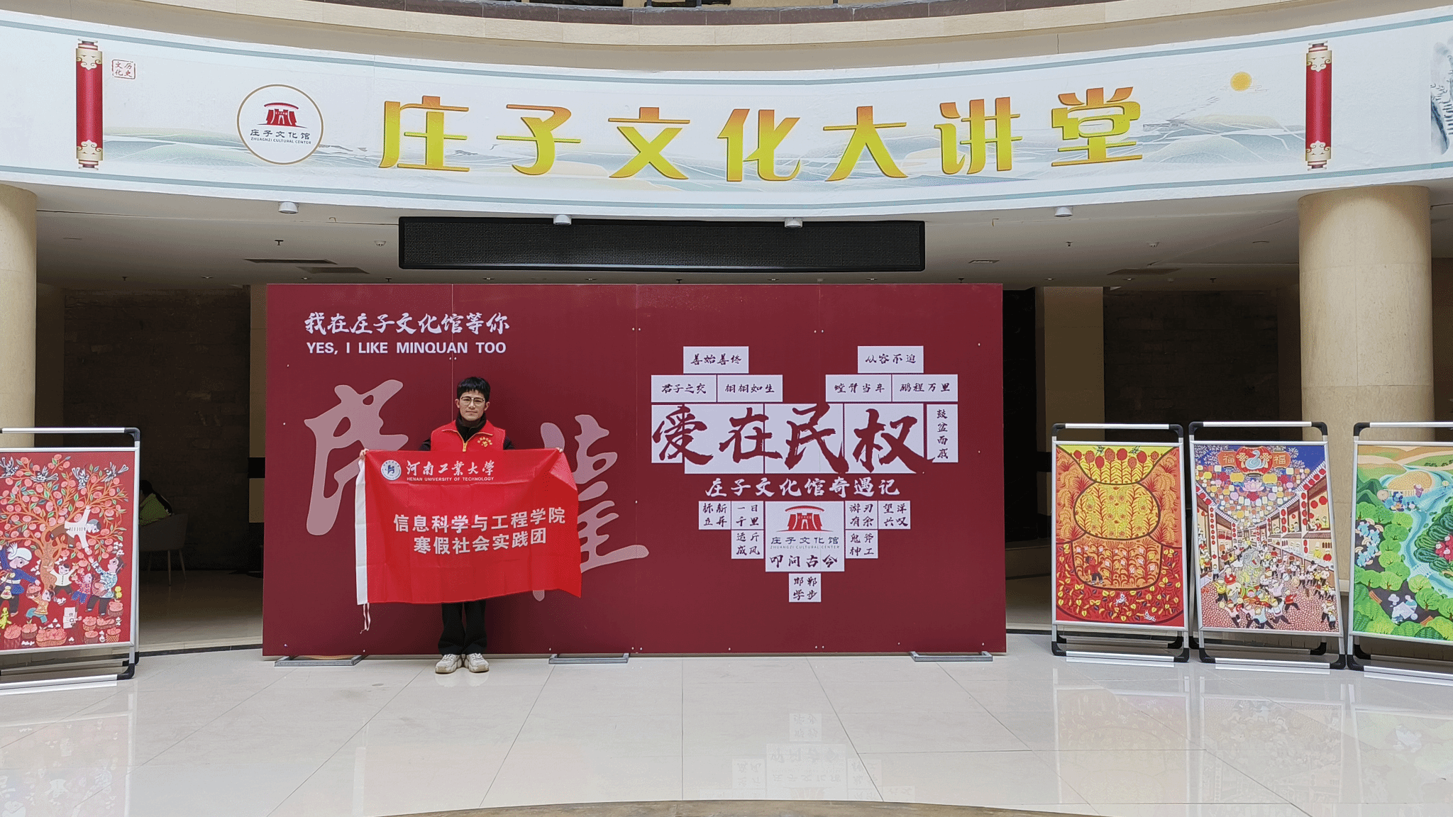 寒假社会实践团团旗在文化馆展览大厅内拍照留念。