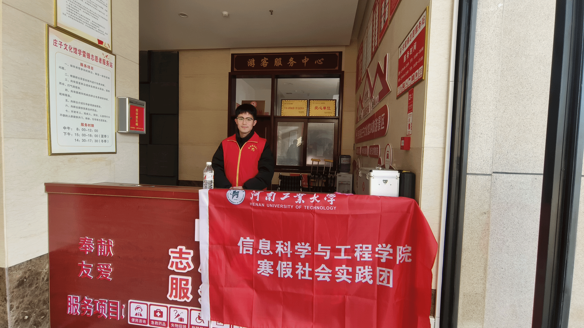 2月10日,实践活动的重点转向了志愿服务。上午,队员们来到文化馆大门口的游客服务中心。在志愿者服务台前,他们秉持着“奉献、友爱、互助、进步”的志愿服务精神,全心全意为游客提供各类服务。队员耐心解答游客关于文化馆展览布局的咨询、协助处理失物招领事宜帮助游客找回丢失的物品、还主动为行动不便的游客提供轮椅以便他们能够更轻松地参观文化馆。每一项服务,队员都做得认真负责、热情周到,他们的付出得到了游客们的一致好评。