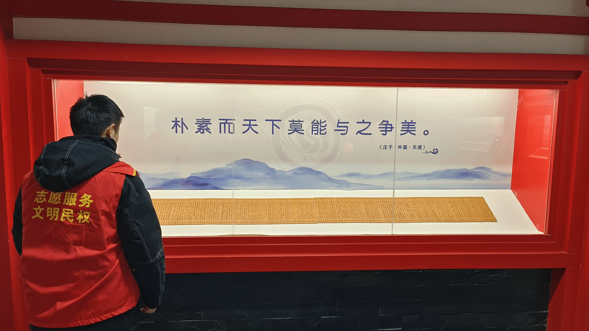 离开背景墙,队员们来到具体展柜前,专注地为游客讲解《庄子・内篇・养生主》。这篇文章蕴含着深刻的养生智慧与哲学内涵,队员们深知其难度,因此在讲解前做了大量功课。他们用通俗易懂的语言,结合生活中的实际例子,深入浅出地阐述其中的道理。“大家看,这里提到的‘庖丁解牛’,不仅仅是在说宰牛的技巧,更是告诉我们要顺应自然规律,这样才能在纷繁复杂的世界中保持内心的平静,达到养生的目的。”队员们的精彩讲解吸引了众多游客驻足聆听,大家纷纷点头表示赞同。