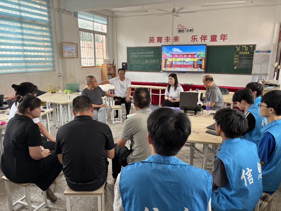 上午8时,团队成员率先投入到冠军小学的场地整理工作中。因邓州市关工委常务副主任路德军、副主任(原邓州市副市长)闫庆吉一行将到访调研21号活动启动仪式筹备情况,队员们仔细打扫美术教室、布置活动所需桌椅,为领导考察做好准备。9时30分,闫副市长与随行人员抵达学校,同冠军小学张峰校长、驻村书记常德海老师就活动流程、场地安排等细节展开讨论(图一)。团队成员在旁聆听学习,深刻感受到领导们基于多年工作经验的细致考量,对“严谨务实”的工作作风有了更直观的认识。