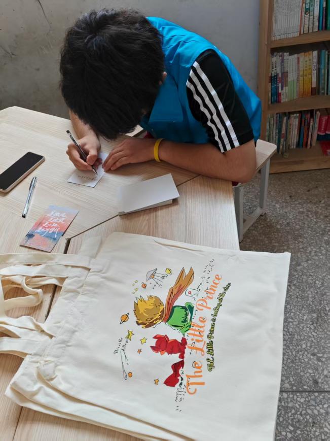 下午3时,团队开展了最后一天的编程教学课程。队员们耐心讲解代码逻辑与模块运用,引导小学生从“玩游戏”向“创游戏”跨越(图二)。课堂上,孩子们在队员的指导下成功写出简易游戏程序,眼中闪烁着探索的光芒,教室里的热烈氛围彰显着教学成果。课程尾声,队员们向每位学生赠送了印有寄语的明信片(每张均署上队员姓名)与手提袋(图三),以小小礼物传递对孩子们的期许。