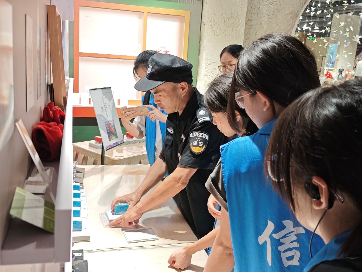 在非遗印章体验区,工作人员手持工具,耐心为成员们演示印章制作。从选料的讲究、雕刻的精细到拓印的技巧,每一步都藏着非遗智慧。成员们围拢在旁,在指导下尝试盖印,感受传统技艺的细腻与庄重,理解印章作为文化载体的传承意义。转过展区,皮影戏演示区传来奇妙声响,工作人员熟练操控皮影,幕布上龙与人物灵动“表演”,光影流转间,传统故事鲜活呈现。成员们凑近观察皮影雕刻细节,还踊跃尝试操作道具,在一拉一扯中,体会这项古老艺术的独特趣味与魅力。
