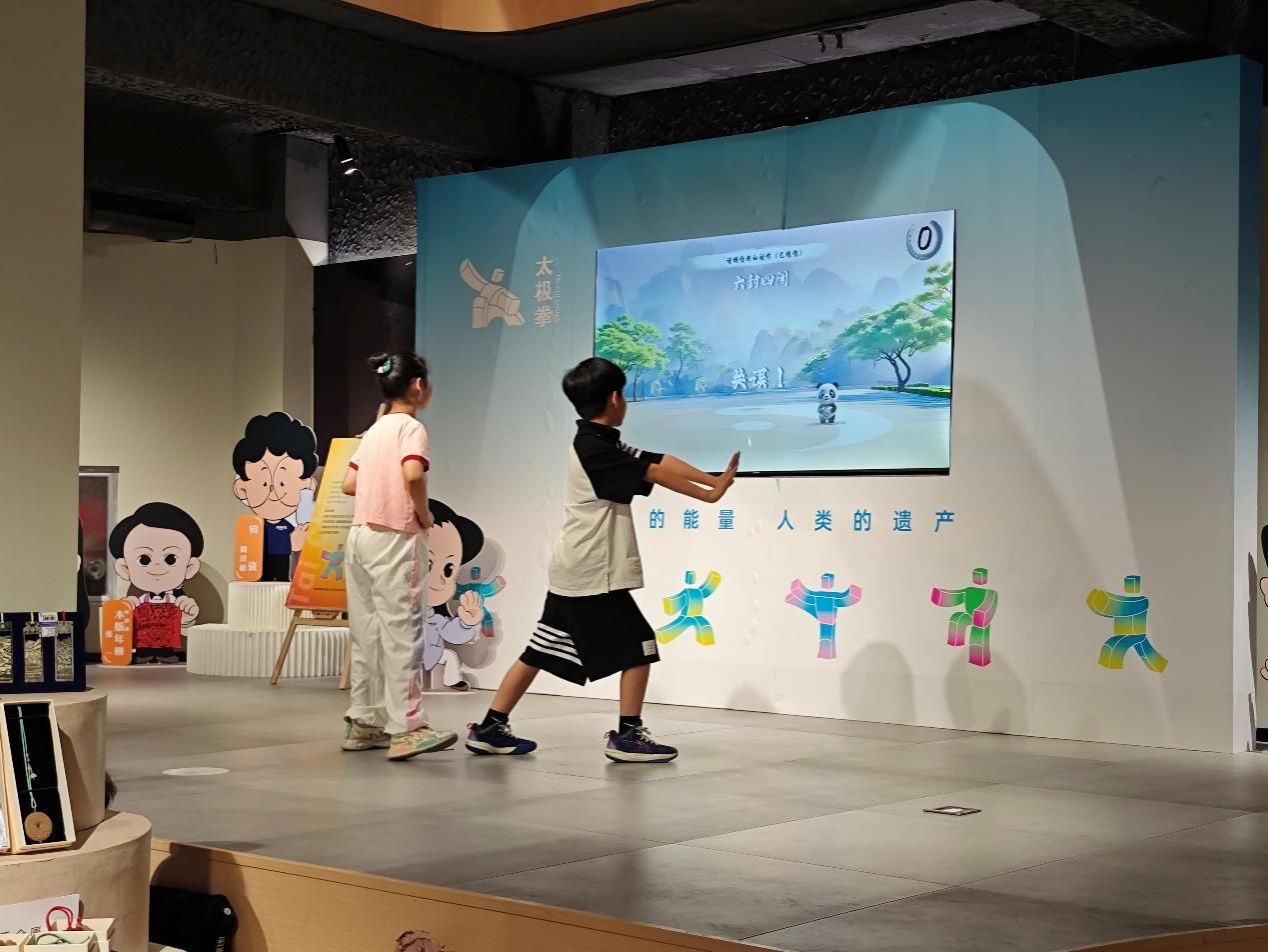 而在互动体验区域,孩子们跟着屏幕练习太极拳的场景,也吸引了团队成员的目光。孩子们一招一式,认真模仿,将太极拳的韵味展现出来。这不仅是对传统武术的传承,也让大家看到非遗文化在青少年群体中焕发出的生机与活力。