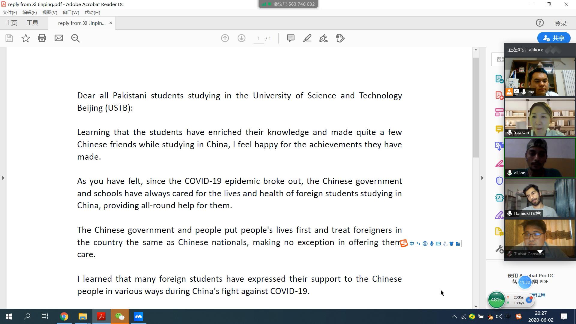 图书馆志愿者的一员,非常想念中国的老师和伙伴们。他在巴基斯坦看到了中国为疫情做出富有成效的努力,希望疫情早点结束,希望大家都健康平安。