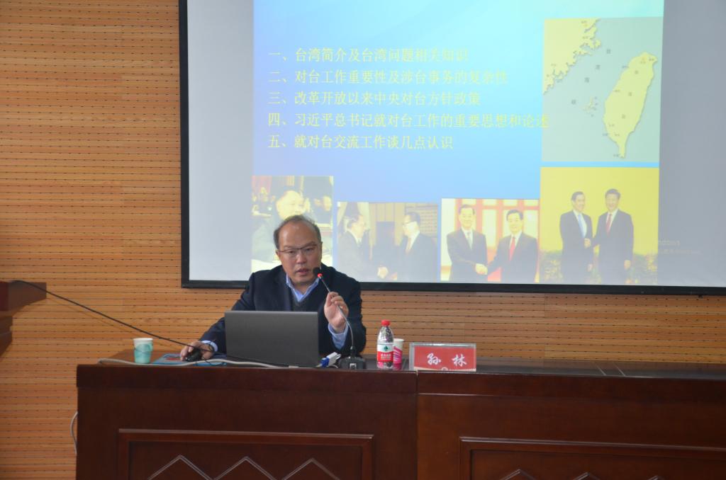 接下来,孙林详细介绍了中国台湾的地理历史、政治军事、社会结构、发展现状,阐述了对台工作的重要性及涉台事务的复杂性;他结合党史讲述了两岸关系发展历程,剖析了台湾问题根源,深刻阐释了习近平总书记关于对台工作的重要思想,强调了对台交流工作中应遵循的基本原则和注意事项。他表示大象传媒